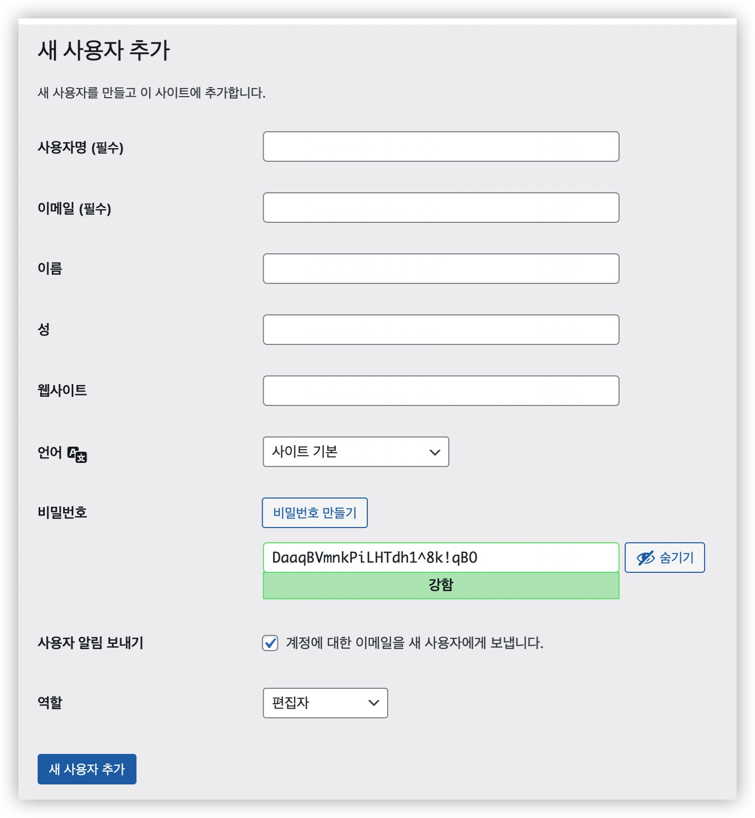 워드프레스 관리자 페이지에서 사용자를 추가해줍니다. 편집자 권한으로 만들어줍니다.