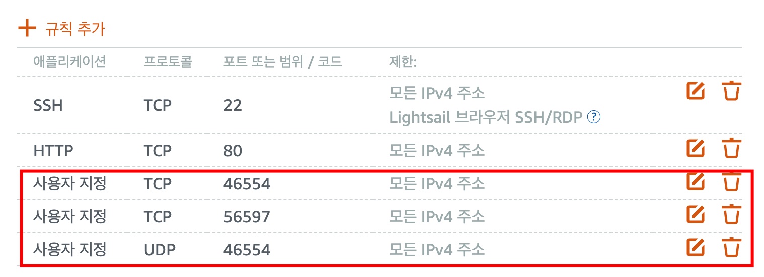 아래 포트를 서버에서 열어줍니다. 이제 aws 라이트세일로 이동합니다.